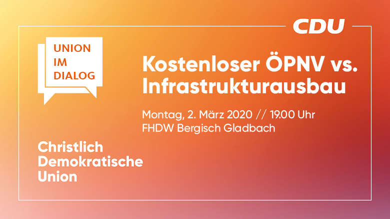 Eintritt frei //Anmeldung erbeten telefonisch unter 02202 935950, formlos per E-Mail an info [at] cdu-rhein-berg.de (subject: Anmeldung%20%22UiD%22) oder online auf www.cdu-rhein-berg.de/union-im-dialog/oepnv